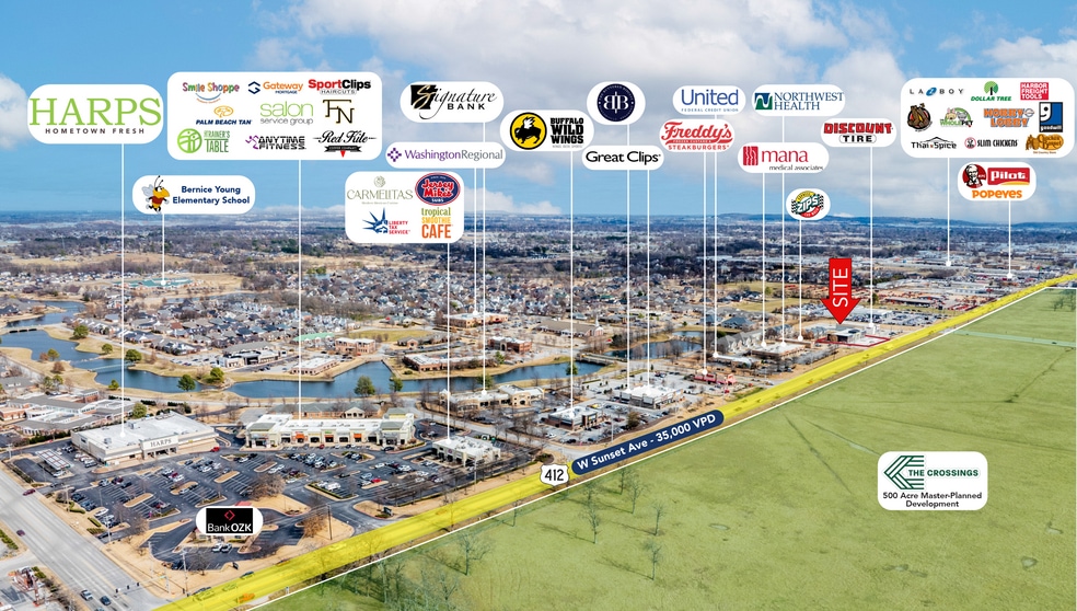 • Both end caps have Drive-Thru capability • Cross-access with adjacent properties to the West • Offers excellent visibility on Hwy 412 (35,000 VPD) • Less than a mile from Interstate 49 • Located in Har-Ber Meadows, the premier neighborhood in Springdale • Delivered in Warm Shell Condition • Directly across from The Crossings, a 500 Acre master-planned development • Located in the epicenter of Springdale’s expanding medical and business corridor with close proximity to Arkansas Children’s NW Hospital, UAMS Orthopaedic & Sports Performance Center, Sam’s Club, Arvest Ballpark, and Har-Ber High School